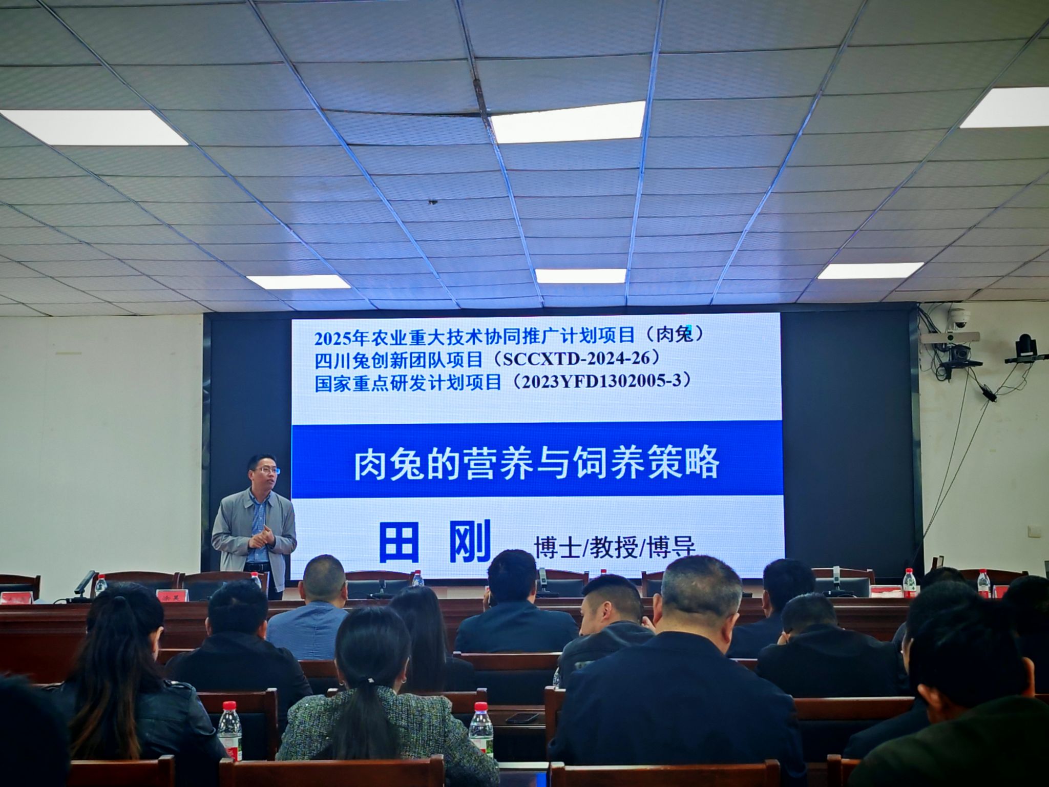 随后,田刚教授为通江县各乡镇养殖技术人员作《肉兔的营养与饲养策略》专题培训。培训围绕肉兔日粮配制核心技术、科学饲养关键要点展开系统讲解,结合科研成果与产业实践经验,分享多项适配本地的实用养殖技术方案,有效提升基层技术人员专业能力。
