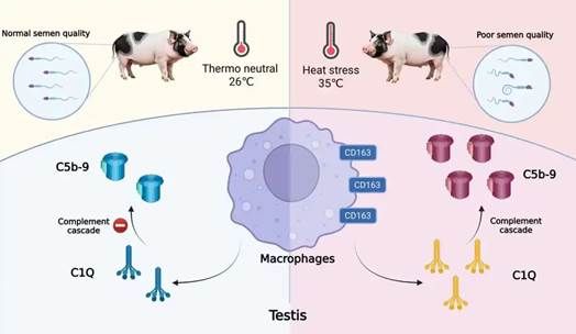 随着全球气候变化的加剧,热应激逐渐成为养猪产业面临的重大威胁。对于种公猪而言,热应激不仅严重影响精液质量,还可能引发睾丸组织损伤。本研究揭示了热应激损害公猪睾丸及降低精液品质的内在机制。研究发现,热应激可导致精索静脉血中白细胞介素-1β和肿瘤坏死因子-α水平升高,表明睾丸出现炎症反应。进一步分析显示,睾丸中CD163+巨噬细胞比例上升,伴随补体经典激活通路起始蛋白C1Q与补体级联反应终产物攻膜复合体(C5b-9)含量增加。回归分析表明,睾丸中C5b-9含量的升高对种公猪的精液质量具有负面影响。该研究成果有助于深入理解热应激引发公猪精液品质下降的生理机制,为制定热应激缓解策略提供了重要的理论依据。