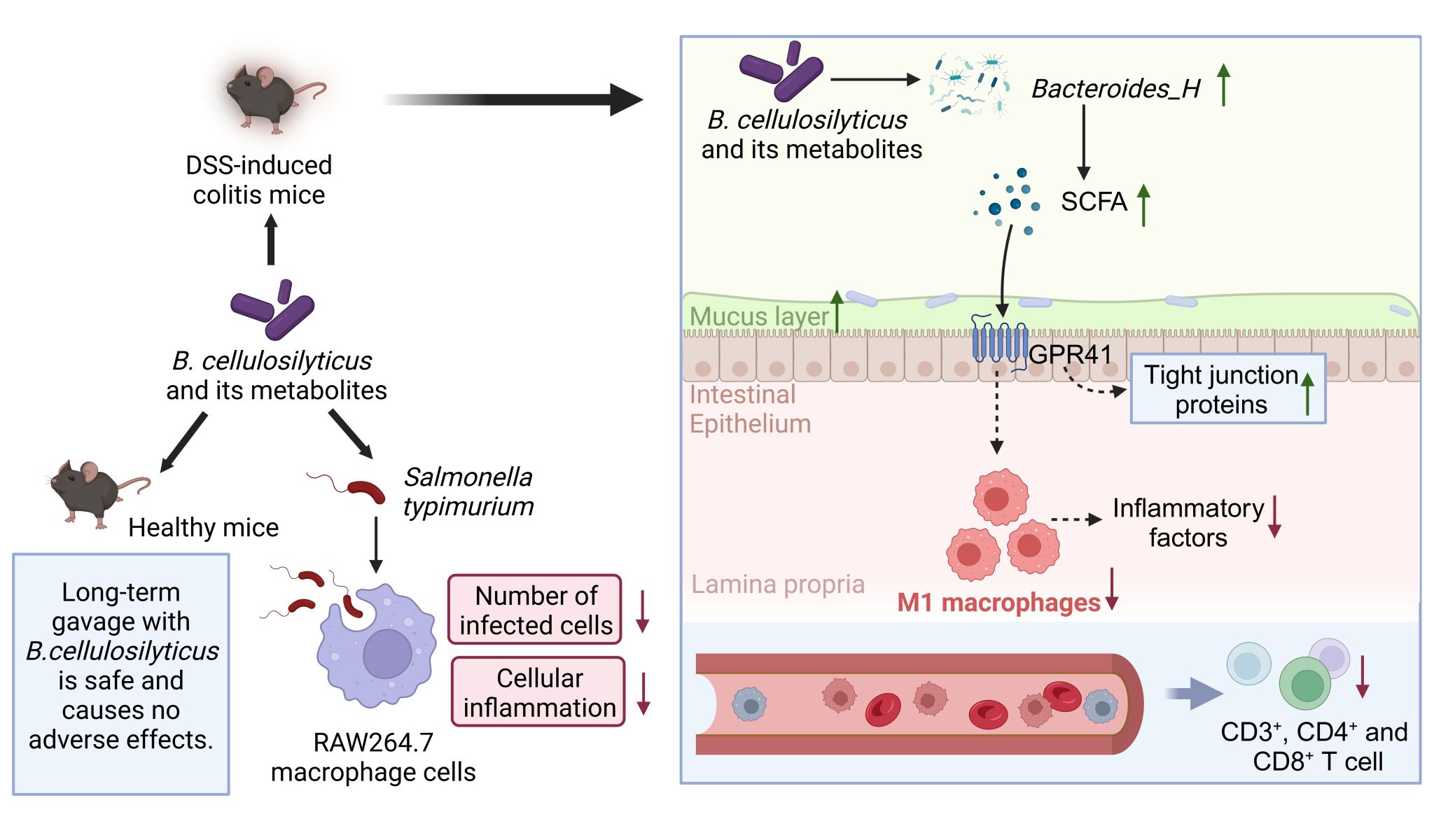 炎症性肠病发病率持续上升,传统治疗手段仍存在副作用及长期疗效受限等问题,开发安全、有效的新型微生物治疗策略具有重要意义。该研究的核心创新在于从猪肠道中成功分离并筛选出具有显著益生潜力的解纤维拟杆菌(Bacteroides cellulosilyticus LYH2)菌株,首次系统揭示了其在代谢调控与免疫调节方面的双重优势。