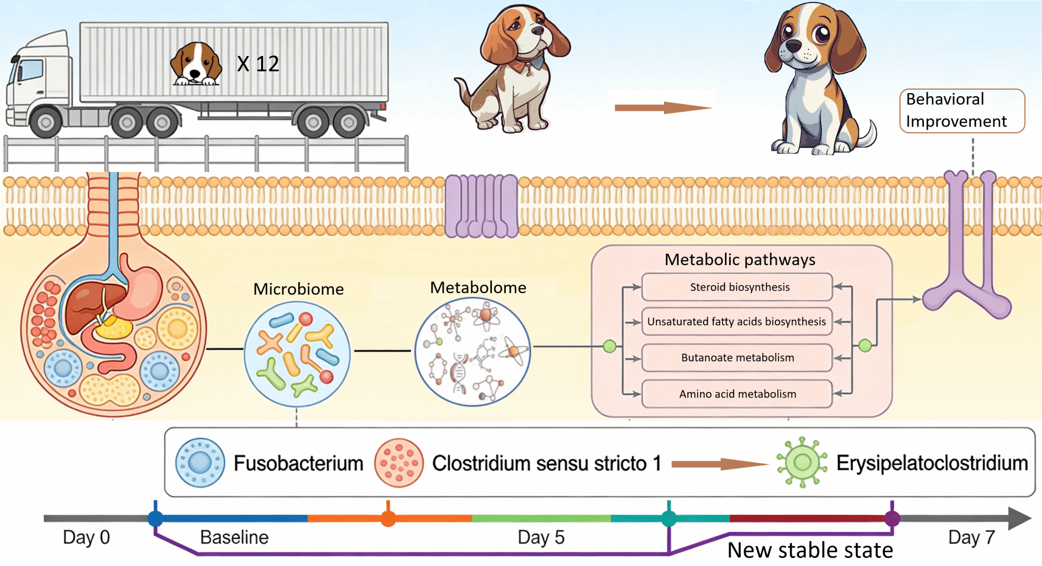 长途运输会对伴侣动物诱发多系统应激反应,然而其在生理、微生物与代谢层面的综合恢复动态仍不够明确。本研究通过系统分析临床指标、粪便微生物组与代谢组,纵向监测了犬只在公路运输后连续7天内的恢复轨迹。本研究选用12只1-2岁健康比格犬,通过中型货车在5天内完成约2080公里的长途运输,抵达后记录每日体重、体况、粪便及应激行为评分,采集新鲜粪便样本用于16S rRNA测序与非靶向代谢组学分析。结果发现,在运输后的恢复期间,各观测指标均呈现时间依赖性变化,且具有不同的动态模式。粪便稠度迅速改善,而行为评分在短期内下降后逐渐趋于稳定。微生物α多样性在初期降低,β多样性在整个恢复期内发生显著的群落结构重组,最终在第7天形成与D0明显不同的新稳态。该转变特征为:早期富集Fusobacterium 和Clostridium sensu stricto 1,后期则由Erysipelatoclostridium主导,与运输后初期以Prevotella 9、Lactobacillus、Phascolarctobacterium、Anaerobiospirillum、Parabacteroides和Prevotellaceae GA6A1为主的优势群落形成鲜明对比。代谢组学分析证实了持续的代谢转变,涉及类固醇与不饱和脂肪酸生物合成途径,以及丁酸盐和多种氨基酸的代谢过程。行为评分的变化与多种特征菌种和标志代谢物强表现出相关性,暗示了肠脑轴的参与作用。至观察期结束,多项指标仍与抵达状态存在显著差异,表明运输后首周内持续存在多系统差异。这些发现阐明了机体对运输应激的复杂协同适应机制,凸显了第7天仍存在的临床、微生物及代谢差异,并为提升运输伴侣动物福利与抗逆性的干预措施提供了理论框架。