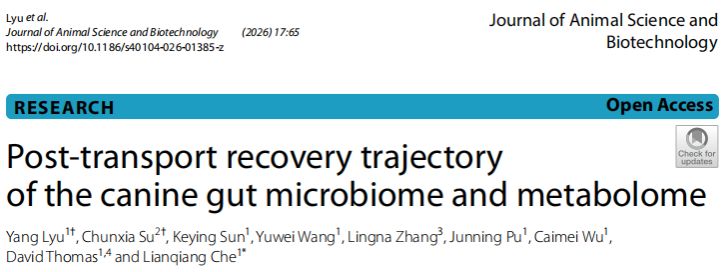 近日,我所动物营养前沿交叉研究室特聘研究员吕阳在农林科学 TOP 期刊Journal of Animal Science and Biotechnology在线发表了题为“Post-transport recovery trajectory of the canine gut microbiome and metabolome”的研究论文。该研究阐明运输应激多系统适应机制,为提升伴侣动物运输福利、制定营养干预策略提供重要理论支撑。