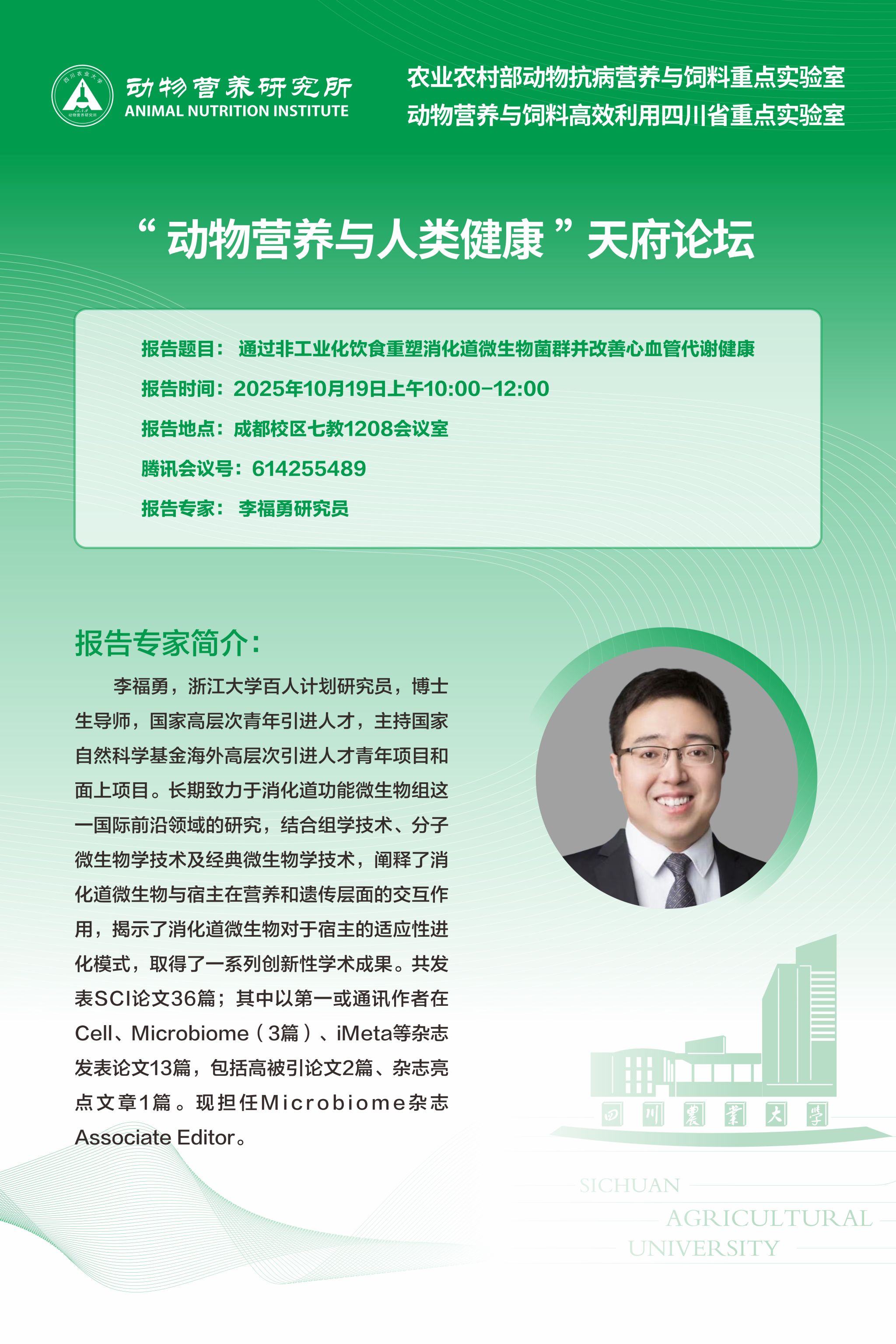 【学术报告】“动物营养与人类健康”天府论坛:通过非工业化饮食重塑消化道微生物菌群并改善心血管代谢健康